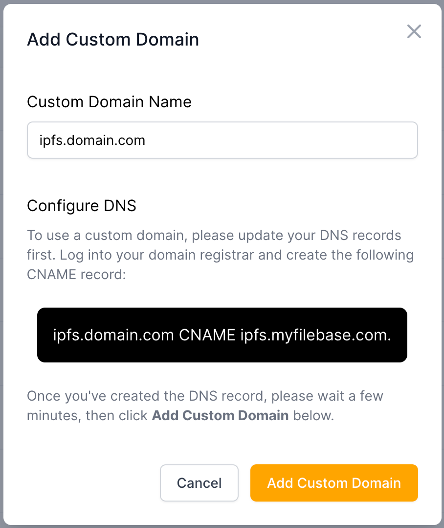 4. On the **Add Custom Domain** dialog, type in your custom domain, then click **Add Custom Domain**. Be sure to perform this step only after completing Step 3 first. Filebase will verify the DNS configuration, provision a TLS certificate, and begin hosting your domain.<br>